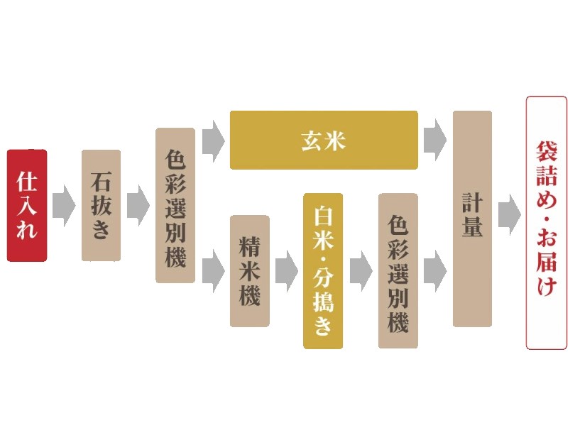 当店では高品質精米には欠かせない色彩選別機などを導入し、複数の行程を経て、安全で高品質な美味しいお米に仕上げ、お客様のもとへお届け致します。